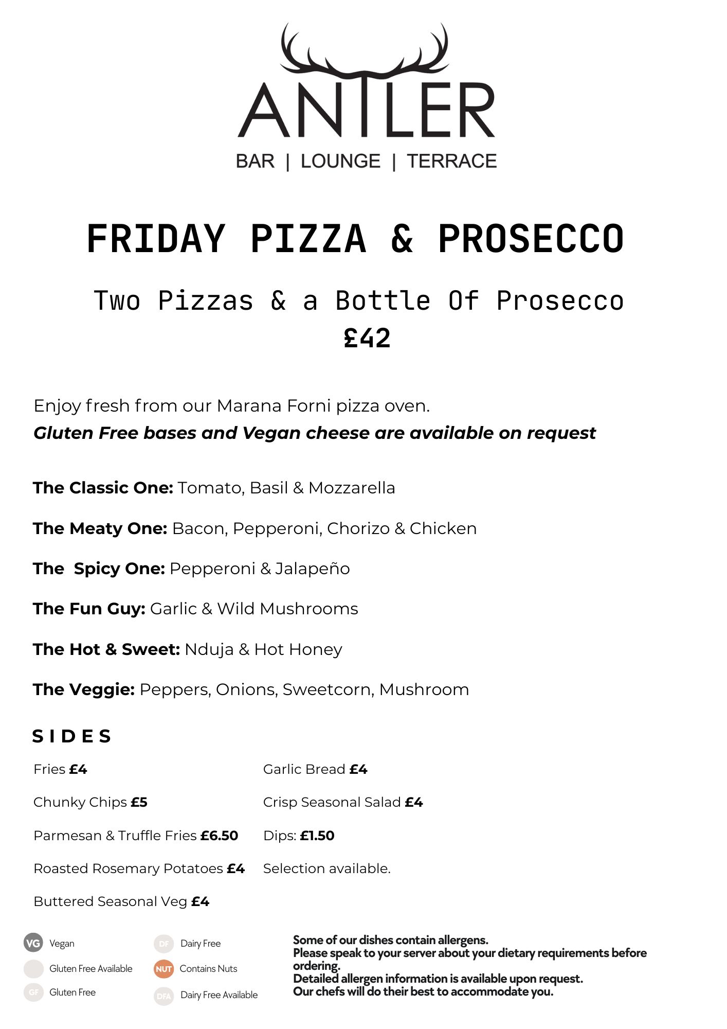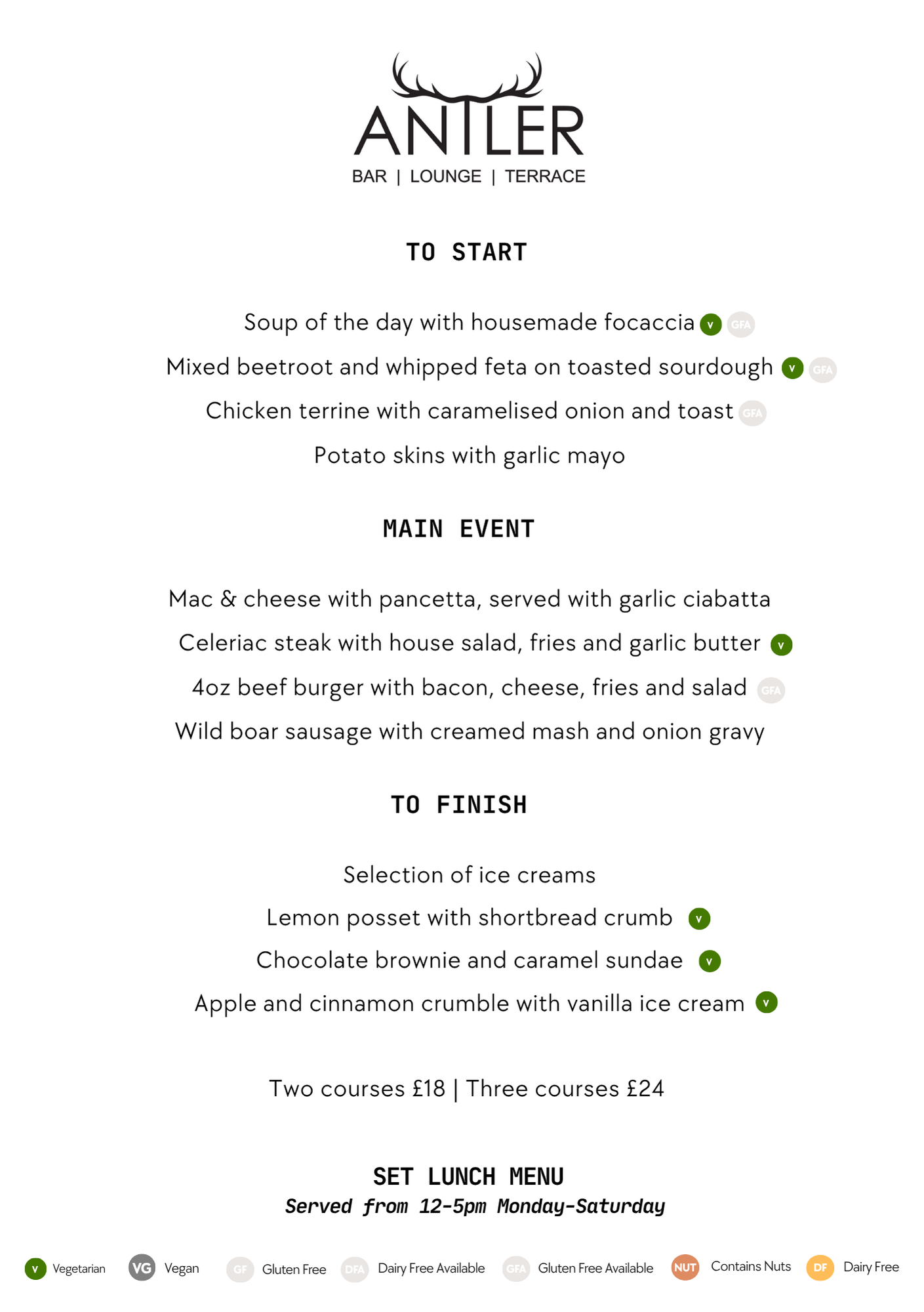 V – Vegetarian. VG – Vegan. GF – Gluten Free.